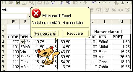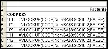 Īn concluzie avem Nomenclatorul pe o Foaie de lucru separata (nu e obligatoriu, e recomandabil) codurile din Nomenclator sunt obligatoriu īn ordine strict crescatoare (adica fara dubluri) si cautarile se fac pe verticala. Īn Fig 10.8 si Fig 10.9 am redenumit domeniul si acest lucru se vede īn argumentele functiei VLOOKUP.