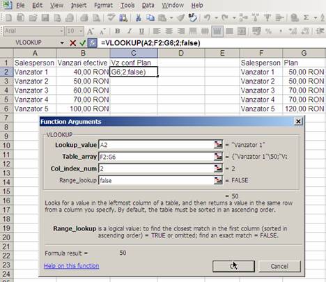 Am considerat urmatorul exemplu: o lista de persoane cu realizarile in vanzari. Fiecare vanzator are un plan de indeplinit. Cu ajutorul functiei Vlook 626e41g up extragem automat valorile din lista PLAN si le dispunem langa vanzarile efective. Conditia False din campul Range Lookup ne asigura ca se cauta valorile identice in cele doua liste ci nu cele apropiate ca valoare.