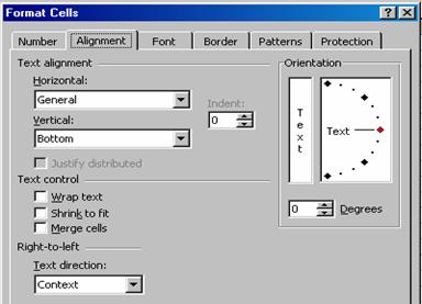 - in zona TEXT ALIGNMENT - selectam alinierea in celule HORIZONTAL (alinierea pe orizontala) sau VERTICAL (alinierea pe verticala)