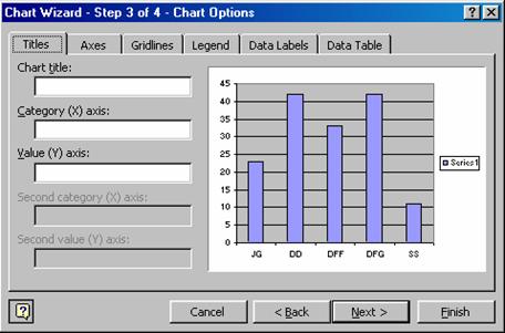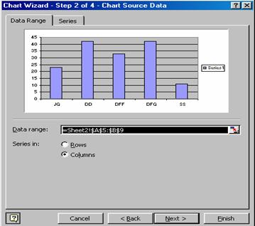 din meniul INSERT CHART sau se da click pe butonul CHART WIZARD de pe bara cu instrumente STANDARD si se va deschide o caseta de dialog cu 4 pasi.