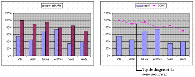 n Executa click dreapta oriunde in interiorul diagramei, daca doresti sa o modifici in intregime, si selecteaza Chart Type. Dupa ce se deschide caseta alege tipul dorit.