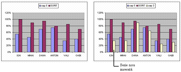 Atentie: Daca stabilesti o anumita valoare maxima, axa Y devine statica, reprezentand seriile de date doar pana la acea valoare. Daca se accepta valoarea implicita, atunci orice modificare a valorii maxime din tabelul de date, in sensul cresterii ei, va modifica automat si valoarea maxima de pe axa Y.