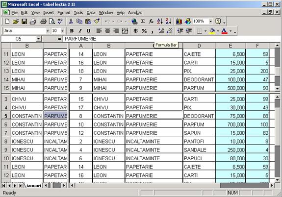 Obs. In cazul in care ecranul este impartit in patru, cele patru panouri vor fi derulate in pereche. Cand foaia de calcul se deruleaza sus-jos cele doua panouri superioare se vor derula simultan. Cand foaia de calcul se deruleaza stanga-dreapta cele doua panouri din stanga se deruleaza simultan.