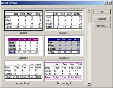 Obs Daca ai dimensionat coloanele si liniile înainte de a aplica AutoFormat, deselecteaza optiunea Width/Height (Latime/Înaltime) deoarece caracteristica AutoFormat dimensioneaza liniile si coloanele corespunzatoare cu cea mai înalta, respectiv cea mai lata intrare.