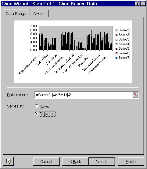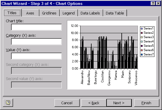 La pasul al doilea se defineste domeniul de date si seriile de date care vor fi reprezentate în grafic; tot acum se alege si modul de selectie a unei serii de date: pe linii sau pe coloane.