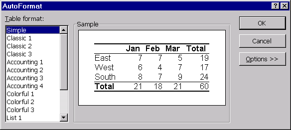 foaia de calcul : poate fi definit automat aspectul foii de calcul prin selectarea unuia dintre formatele standard prezentate de functia AutoFormat... a optiunii Format din meniul orizontal.