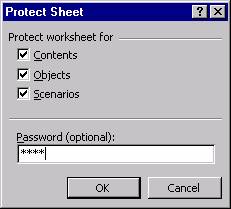 Executa secventa ToolsProtectionProtect Sheet. Va aparea caseta Protect Sheet care iti va permite sa introduci o parola pentru protejarea foii de calcul.