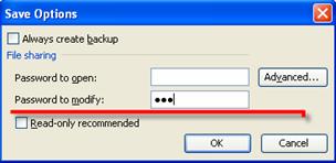 Stabilirea unei parole la salvarea documentului are ca efect interzicerea salvarii documentului sub aceasi denumire. Astfel orice modificare fiind neinclusa in versiunea originala. In acest mod se poate asigura faptul ca fiecare utilizator deschide mereu aceeasi versiune a registrului de calcul Excel.