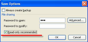 In fereastra Save Options, se marcheaza caseta de control Read-only recommended si se va apasa butonul OK: