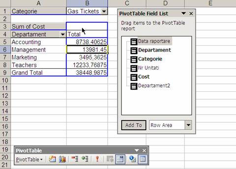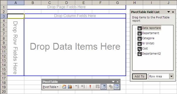 Row Area - Se alege si se dispune categoria dupa care se doreste sa se analizeze pe rand. Se dispun prin click-and-drag din Pivot table Field List