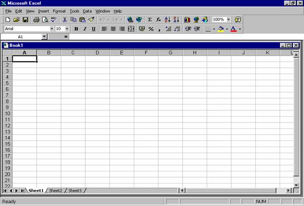 Dupa lansarea în executie a MS Excel-ului se va deschide automat o fereastra, care contine un fisier cu numele implicit Book1.xls; acesta poate fi schimbat cu un nume propriu, sugestiv, la prima operatie de salvare.