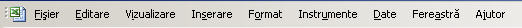 Bara de meniuri este de obicei localizata chiar sub Bara de titlu. Aceasta ne ofera urmatoarele optiuni (meniuri): Fisier (File), Editare (Edit), Vizualizare (View), Inserare (Insert), Format (Format), Instrumente (Tools), Tabel (Table), Date (Data), Fereastra (Window) si Ajutor (Help). Prin intermediul acestor meniuri puteti da diverse instructiuni aplicatiei. Pozitionati cursorul mouse-ului pe numele meniului pe care doriti sa-l accesati si dati un click de stānga. Aceasta va avea ca si efect deschiderea unui meniu īn care va puteti deplasa fie prin intermediul tastelor (sagetile stānga-dreapta, sus-jos), fie cu ajutorul mouse-ului.