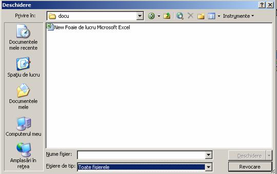 Din aceasta fereastra putem alege de unde anume sa deschidem registrul de calcul (e.g. din Documentele mele (My Documents), sau de pe oricare din partitiile calculatorului (A:, C:, etc.).