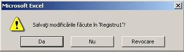 Prin intermediul butonului 2 (vezi figura) avem posibilitatea de a īnchide fiecare registru de calcul īn parte, iar prin intermediul butonului 1 putem īnchide īntreaga aplicatie Microsoft Excel si implicit toate registrele deschise. Īn cazul īn care ultimele modificari realizate īn registru nu au fost salvate, actionarea oricarui buton mai sus mentionat va avea ca si efect aparitia ferestrei de mai jos: