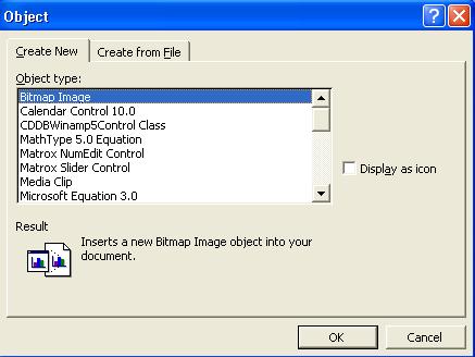 v Fisa Create New ne permite crearea unui nou obiect. Se alege categoria "Object type" de unde se poate alege tipul obiectului ce se creaza. Aceasta lista cuprinde o multitudine de tipuri de obiecte ce pot fi create: imagine Bitmap, Microsoft Equation, wave sound, document Microsoft Word, document Microsoft Excel, document PowerPoint, etc.