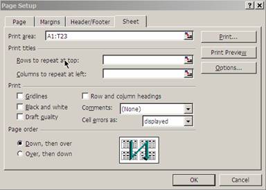 De pe tabul Sheet putem alege randurile care se vor repeta la inceputul tabelului pe toate paginile (in cazul in care avem o lista mare care se va printa pe mai multe foi).