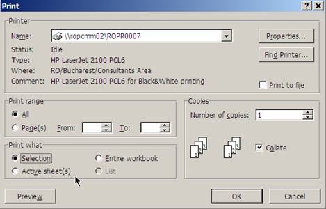 Imprimarea se face din meniul File-Print. Se pot imprima mai multe foi de lucru (daca acestea sunt selectate), selectii sau intreg workbook-ul.etc.