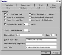 In meniurile derulante comenzile care necesita informatii suplimentare au atasate trei puncte (...). Alegerea unei astfel de comenzi va produce afisarea unei casete de dialog în care puteti introduce informatiile necesare executarii comenzii. Spre exemplu, comanda Options din meniul Tools va conduce la afisarea unei casete de dialog care contine 10 sectiuni, carora le corespund etichete plasate în partea superioara. Fiecare sectiune este formata din tipuri diferite de optiuni, pe care le puteti utiliza pentru a personaliza programul Excel. Daca selectati eticheta General, va aparea caseta de dialog de mai jos: