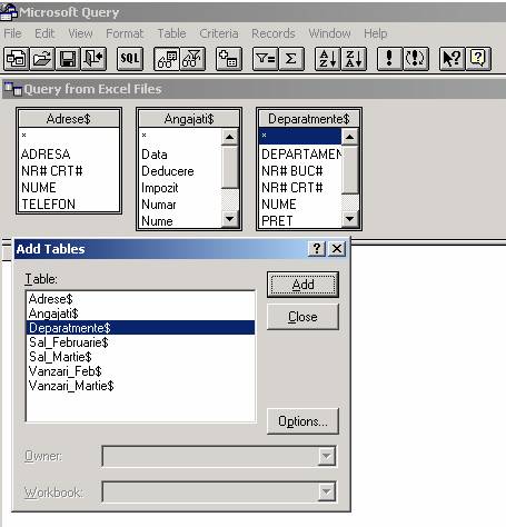 Daca nu ai selectat un tabel prestabilit atunci cand ai definit sursa de date, primul lucru despre care vei fi intrebat cand lansezi Microsoft Query este ce tabel doresti sa folosesti in interogare. Trebuie sa remarci ca, in timp ce Query Wizard trece direct la selectarea coloanelor din interiorul tabelului, Microsoft Query este proiectat sa lucreze inca de la inceput cu mai multe tabele. Microsoft Query pleaca de la ipoteza ca doresti o imagine mai mare si va cuprinde un domeniu mult mai larg din baza de date, comparabil cu posibilitatile Query Wizard.