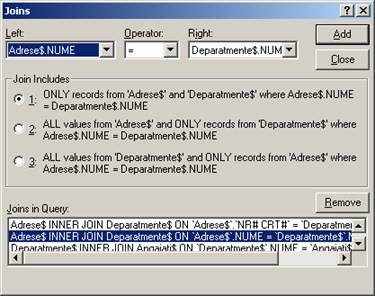 Nu ai nevoie de mai multe asocieri intre tabele – una este suficienta. In cazul in care creezi accidental o asociere pe care nu o doresti, executa dublu click pe linia ei pentru a afisa caseta de dialog Joins. Corecteaza asocierea dupa necesitati sau selecteaz-o din lista Joins in Query si executa click pe butonul Remove.