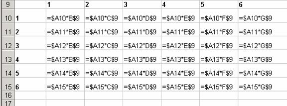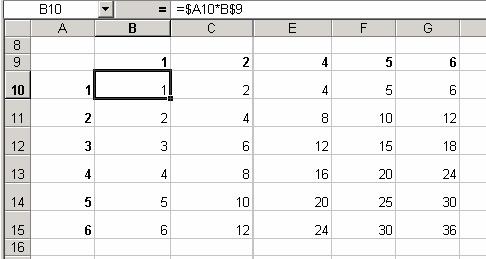 Referinte mixte. Este posibil ca, uneori, într-o formula sa fie nevoie de referinte mixte. Referintele mixte contin adrese de celule absolute si relative (exemplu: A$1, $A1). De exemplu, când creezi o formula în care vrei sa înmultesti valorile de pe o anumita coloana cu valorile aflate pe un anumit rând vei utiliza referinte mixta cu o coloana fixa si un rând relativ pentru deînmultit si o coloana relativa si un rând absolut pentru înmultitor.