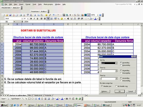 Nota: pentru exemplificare, vezi fisierul Curs Excel, foaia de calcul „Sortari si subtotaluri”.