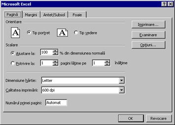 - Butonul Initializare/Setup - afiseaza caseta de dialog Initializare pagina/Page setup, pentru a stabili optiunile care controleaza aspectul foii de lucru tiparite.