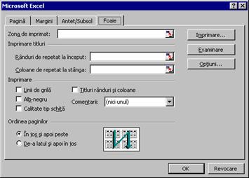 - Butonul Imprimare/Print - afiseaza caseta de dialog Imprimare/Print, în care se pot stabili optiunile de tiparire apoi se tipareste foaia de lucru selectata.