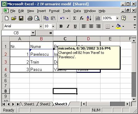 Functia Track Changes trebuie activata inainte de a incepe sa tii evidenta evolutiei foii de calcul. Daca aceasta functie nu este apelata, modificarile facute de altii se vor integra in continutul foii tale si nu o sa mai poti identifica cine si ce modificari a efectuat.