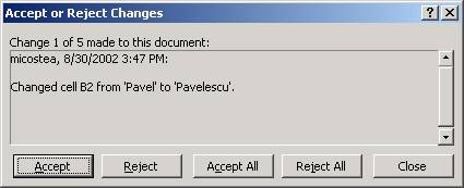 Executa click pe OK pentru a incepe sa revezi modificarile. Atunci cand programul Excel descopera prima modificare, o va descrie in caseta de dialog Accept or Reject Changes.