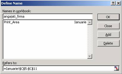 În caseta Names in workbook selecteaza întregul nume si apoi introdu numele nou pentru referinta aleasa, dupa care executa click pe Add.