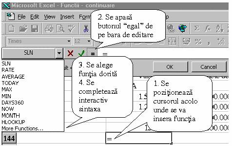 Apelarea selectorului de functii se face prin apasarea butonului = (egal) aflat pe bara de editare, dupa care se deschide lista functiilor predefinite, se alege functia dorita, dupa care se completeaza interactiv argumentele.