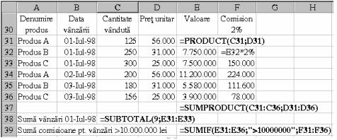 comisioanelor la vânzarile de produse (5% din valoare) pentru valorile vândute de peste 10.000.000 lei. În acest caz câmpul de evaluat reprezinta valoarea (E31:E36), criteriul este de tip text si anume ">10000000", iar câmpul de însumat este comisionul (F31:F36).