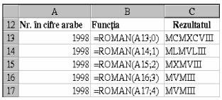 =ROMAN(numar; format) converteste numerele din format cifric arab în text ce semnifica numere cu format cifric roman. Formatul -cu valori de la 0 la 4- reprezinta gradul de concizie al numarului roman nou generat. Numarul arab de transformat trebuie sa fie întreg. Un exemplu de astfel de transformare este prezentat în figura 1.60.