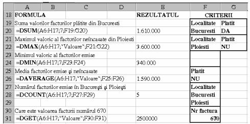 functii baza de data (Database): efectueaza diferite calcule asupra unor rubrici, într-o baza de date, corespunzator unor criterii definite;