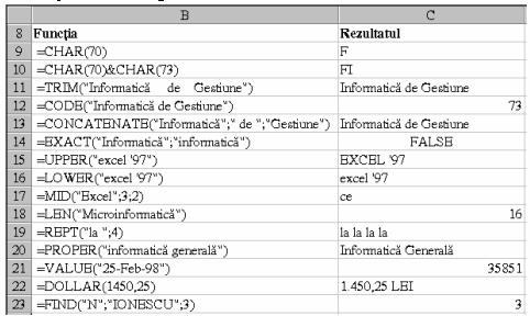 functii text sau sir de caractere (Text): ofera informatii legate de textul existent în celule si permit operatii cu etichete;