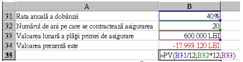 O persoana fizica doreste încheierea unei polite de asigurare pentru o perioada de 20 de ani cu o rata anuala a dobânzii de 40%. Asiguratul urmeaza sa plateasca lunar o prima de asigurare de 600.000 lei. Costul anuitatii perceput de asigurator este estimat la 19.000.000 lei. În figura urmatoare s-a calculat valoarea prezenta cu ajutorul functiei PV.