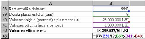 Pentru exemplificarea functiei financiare FV, oferim urmatoarea aplicatie: o persoana fizica doreste efectuarea unui plasament de 25.000.000 lei pe o perioada de 9 luni la o banca comerciala, pentru o dobânda anuala de 55%. Persoana fizica urmeaza a depune lunar la banca, alaturi de depozitul initial câte 1.000.000 lei pe aceeasi perioada.