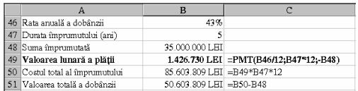 Valoarea lunara a platii catre banca pentru creditul acordat a fost calculata (în celula B49) prin functia PMT în figura 1.84: