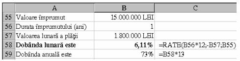 =RATE(numar de perioade; valoarea platii; valoare prezenta) returneaza rata dobânzii pe perioada unei anuitati, pentru un împrumut sau o investitie. Pentru exemplificare presupunem efectuarea unui împrumut printr-un credit de 15 milioane lei pe timp de un an, cu o valoare lunara de rambursat în suma de 1.800.000 lei.