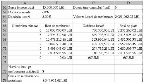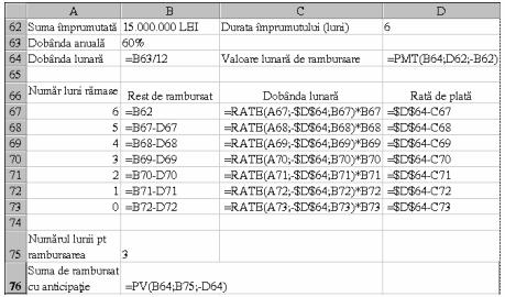 În figura 1.85 se calculeaza în celula E58, dobânda lunara perceputa de banca, iar în celula E59 dobânda anuala pentru suma împrumutata.