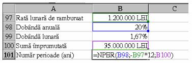 În exemplul ilustrat în figura 1.88 s-a calculat numarul de perioade în ani în care un întreprinzator trebuie sa restituie un împrumut de 35 milioane lei, cu o dobânda anuala de 20%, platind lunar 1.200.000 lei.