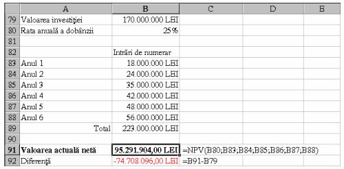 În figura 1.89 s-a construit un model economic, cu ajutorul caruia s-a calculat prin functia NPV (în celula B91) valoarea actuala neta a investitiei, care a fost de 95.291.904 lei daca rata dobânzii a fost de 25% (celula B80). A face o investitie de 170 milioane lei, antreneaza cheltuieli suplimentare de 74.708.096 lei fata de cheltuielile initial prevazute.