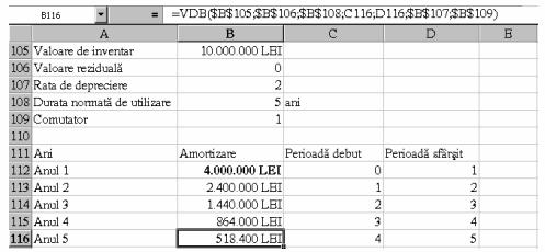 Se remarca faptul ca ultimele doua anuitati sunt egale, metoda de calcul a amortizatii trecând automat de la procedeul degresiv la cel linear în anul patru.