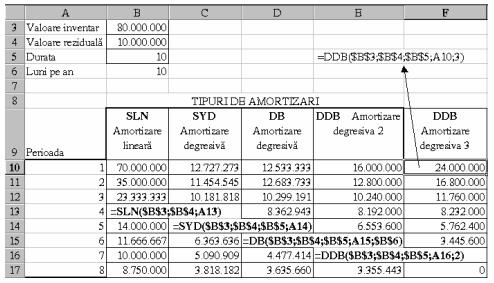 luni pe an de functionare a imobilizarii) returneaza amortismentul degresiv absolut, tinând cont de numarul de luni pe an de functionare a imobilizarii, deci ia în calcul un posibil aspect sezonier de utilizare al acesteia. Cele doua functii SYD si DB sunt calculate pentru o rata de depreciere egala cu 2.