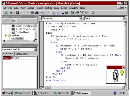 Pentru întelegerea procesului de definire a unei functii proprii, furnizam urmatorul exemplu: sa se defineasca o functie numita Spor, care pe baza salariului si a vechimii unui angajat, sa calculeze sporul de vechime ce i se cuvine. Se stie ca algoritmul de calculare a sporului de vechime este urmatorul: