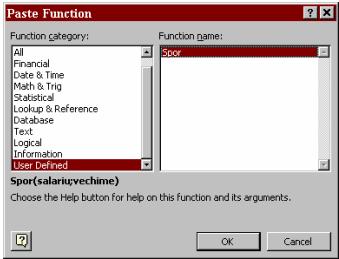 b) se apeleaza asistentul de functii. În prima fereastra a asistentului Paste Function se selecteaza din categoria User Defined, functia Spor (figura 1.95a).
