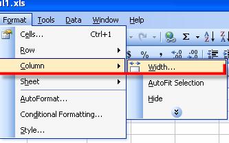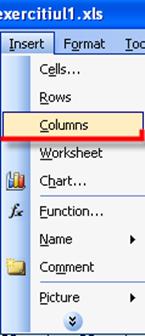 Redimensionarea latimii coloanei se poate realiza prin accesarea meniului Format din bara de meniuri, se alege optiunea Column din lista derulanta ca in imaginea urmatoare: