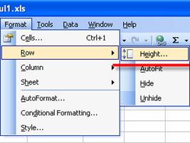 Redimensionarea inaltimii unui rand se poate realiza prin accesarea meniului Format din bara de meniuri, se alege optiunea Row din lista derulanta ca in imaginea urmatoare: