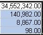 Daca informatia introdusa este de tip numeric aceasta este in mod normal aliniate la dreapta, ceea ce inseamna ca ultimul caracter din celula apare langa marginea din dreapta a celulei. In mod normal, alinierea la dreapta este folosita pentru datele care au format numeric, deoarece toate numerele dintr-o coloana sunt aliniate sub aceleasi pozitii ale cifrelor, dupa cum este prezentat mai jos: